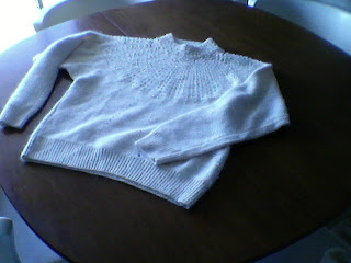 The pants featured above were ordinary white linen pants which were spotted with blue dye. The sweater was turned into a boatneck by removing the turtleneck.